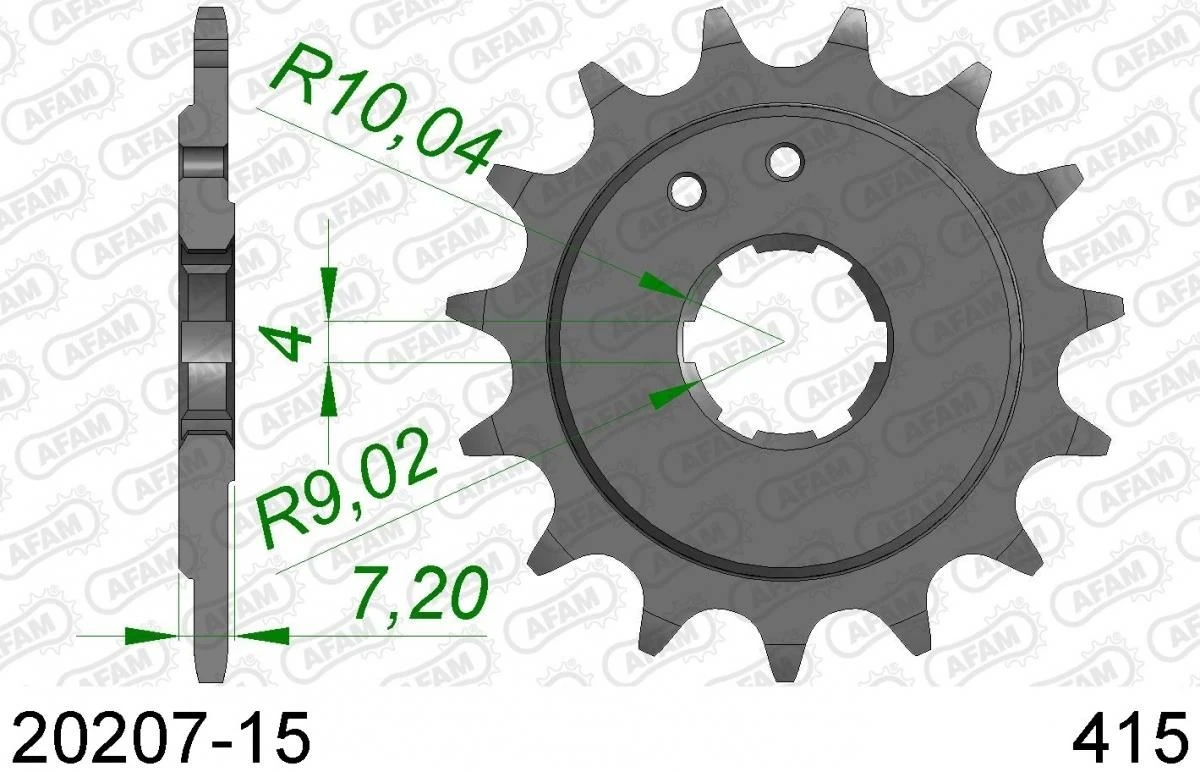 Een stalen 15 tands AFAM voortandwiel. De tandwielen van AFAM zijn gemaakt van C45 staal met inductie geharde tanden, het tandprofiel is concentrisch, plat en perfect rond. Door deze samenstelling zijn de AFAM tandwielen perfect ter vervanging of zelfs ter verbetering van de OEM tandwielen.